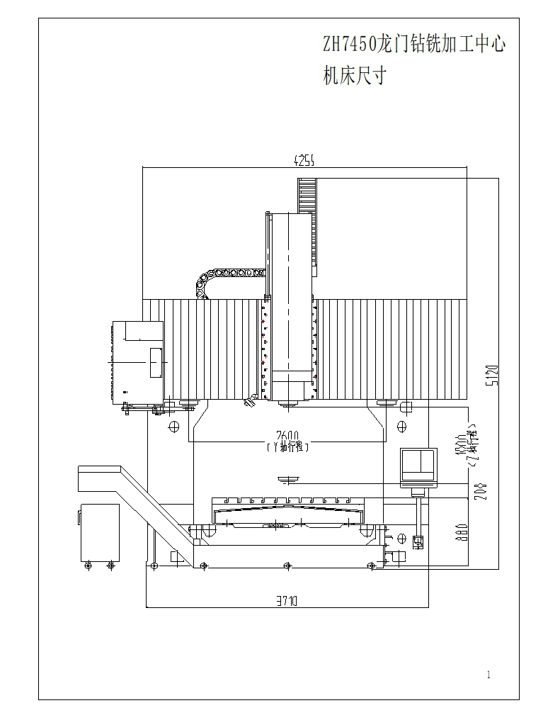 機床采用定梁雙立柱龍門式框架結(jié)構(gòu),工作臺在床身上作x向移動?;斑B同滑枕在橫梁上作y向移動,滑枕在滑鞍上作z向移動。三軸由交流伺服電機驅(qū)動,通同步帶傳動預(yù)拉伸結(jié)構(gòu)的滾珠絲杠,實現(xiàn)三軸的運動與定位。主軸傳動采用主軸交流伺服電機實現(xiàn)主軸無級變速。安裝在橫梁左側(cè)的盤式刀庫,實現(xiàn)刀庫與主軸上刀具的互換。床身兩側(cè)安裝有排屑裝置,自動的把鐵屑排出到機床外。